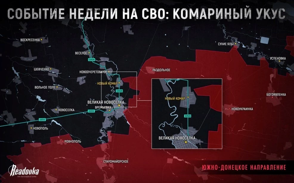Самые ожесточенные бои сейчас идут за Новый Комар - ВСУ предпринимают попытки контратаковать и вновь вытеснить русскую армию. Цель сражения, конечно, не сама полупустая деревня, а дорога, ведущая на север, через нее происходит снабжение украинских войск в Великой Новоселки. Само поселение пока под контролем противника, но делу время. С его захватом ВС РФ откроют себе дорогу для уничтожения всей линии укреплений, тянущейся на запад, и тем самым создадут проблемы ВСУ на застывшем фронте Запорожья, сообщает Telegram-канал Readovka.