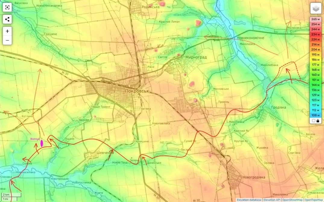 Таким образом, Вооружённые силы России расширили контроль и над дорогой Т0515, соединяющей Покровск с крупным «узловым» селом Константинополь. Одновременно с этим ВС РФ продолжают движение к границам Днепропетровской области, осуществляя охват Покровска с южного фланга. Та же Новоелизаветовка находится всего в нескольких километрах от границы с этим регионом.