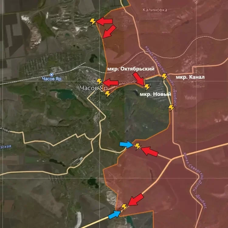В Часов Яре подразделения ВС РФ штурмом взяли один из опорников ВСУ в северо-западной части микрорайона Новый. Бои идут также на северо-восточных и юго-восточных окраинах. Возможно, что наши бойцы таки решили зачистить этот микрорайон, угодивший в широкий «карман». Присутствие там ВСУ явно неблагоприятно сказывается на продвижении ВС РФ в Часов Яре.