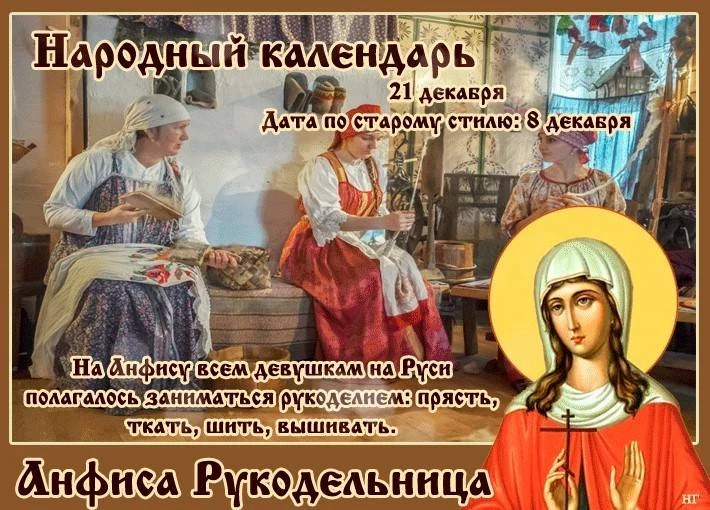 21 декабря в русских народных традициях был посвящен Анфисе Римской, которую часто называли Анфисой Рукодельницей. Этот день был особенным для девушек, так как им полагалось заниматься рукоделием. Шить, прясть или ткать следовало в одиночестве, чтобы избежать сглаза и дурных глаз со стороны.